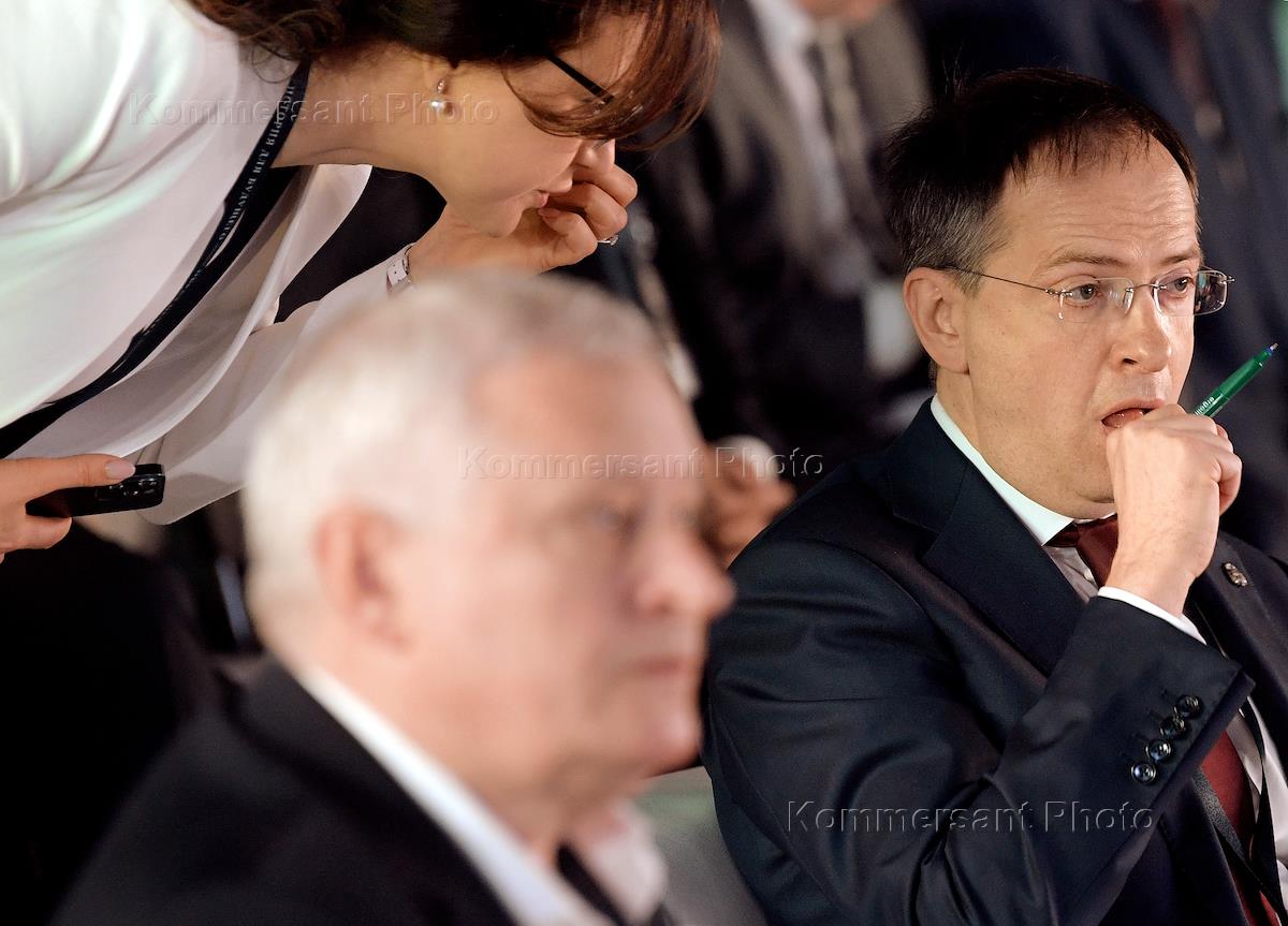 Forum "History for the Future. The Image of Peter" at VDNH in the pavilion "Russia - My History". Russian presidential aide Vladimir Medinsky (left) at the forum.