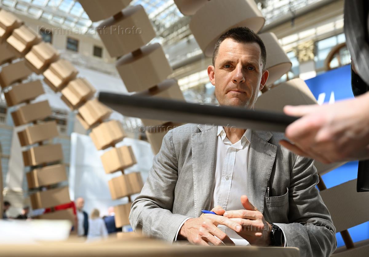 Международная выставка архитектуры и дизайна "Арх Москва" в Гостином дворе. Руководитель Департамента развития новых территорий города Москвы Владимир Жидкин на выставке.