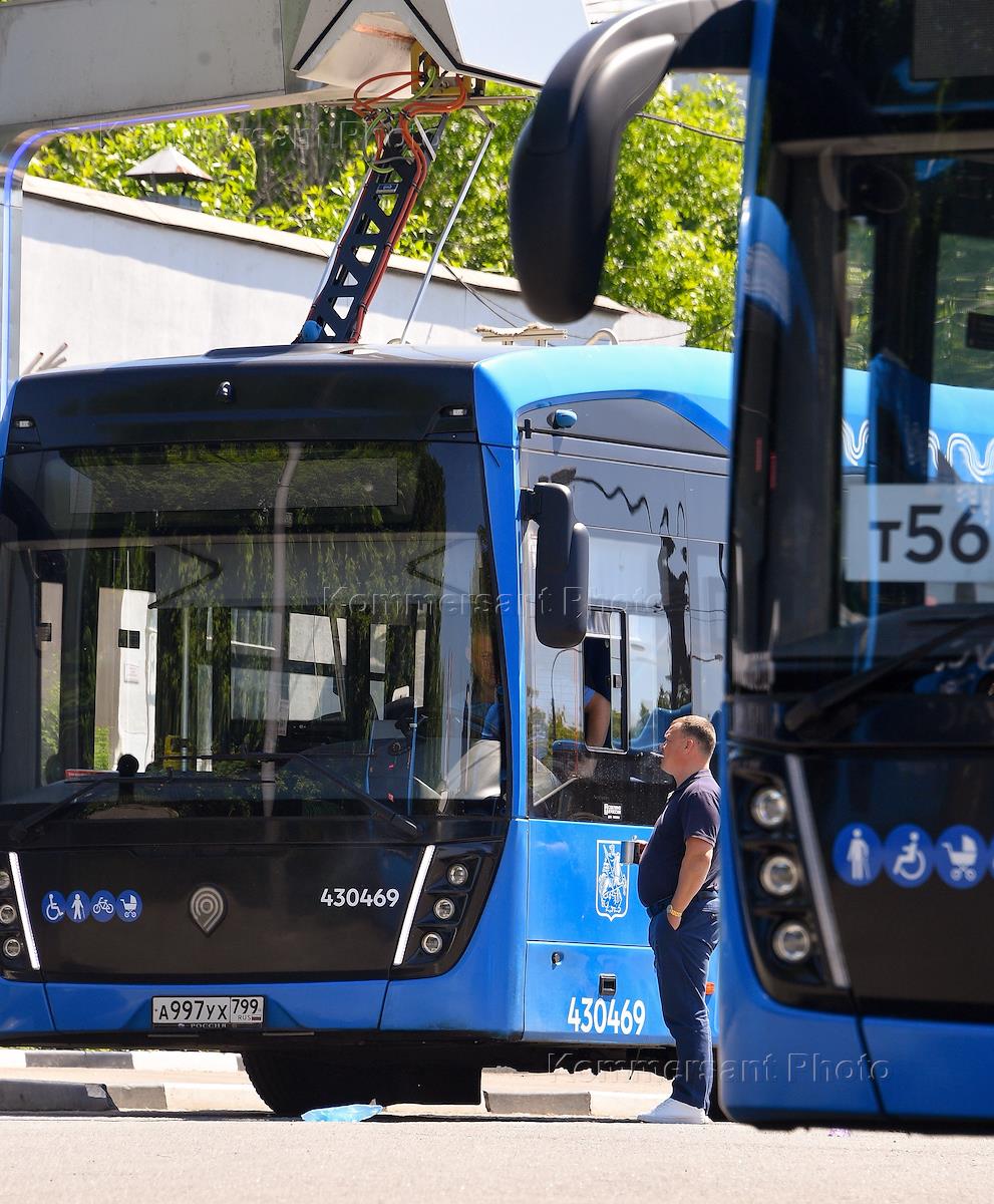 Станции зарядки электромобилей и электробусов в Москве. Жанровая фотография. Водители во время подзарядки электробусов.
