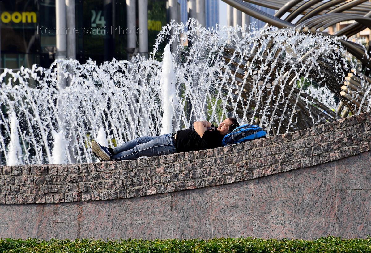 Жанровая фотография. Мужчина лежит у фонтана.