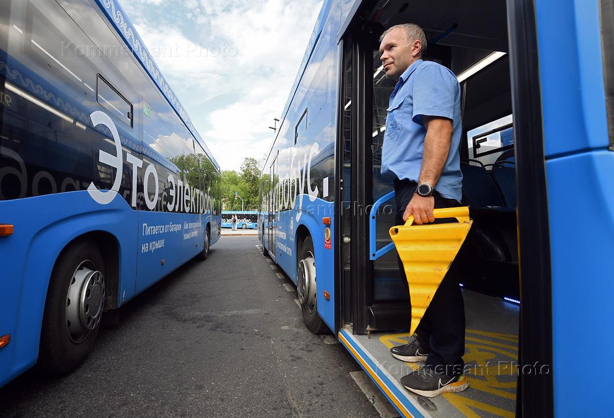 Charging stations for electric vehicles and electric buses in Moscow. Genre photography. Drivers while recharging electric buses.