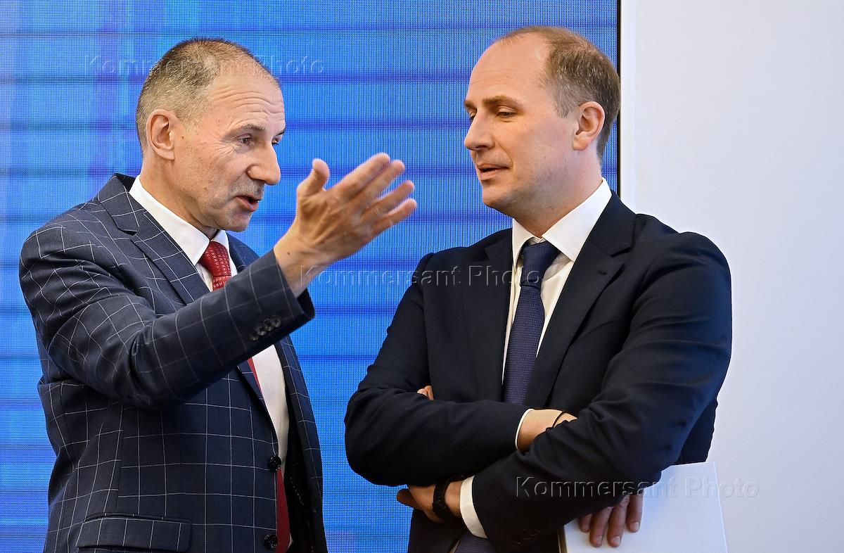 Meeting of the Executive Committee of the Russian Olympic Committee in the office of the ROC. The agenda includes the concept of the Program to promote the development of Summer Olympic sports, the training of Russian athletes and ensuring participation in the Games of the XXXIII Olympiad in 2024 in Paris. ROC President Stanislav Pozdnyakov (left) and ROC CEO Vladimir Sengleev, ROC Presidential Aide Andrei Mintsev (right) after a meeting of the ROC executive committee.