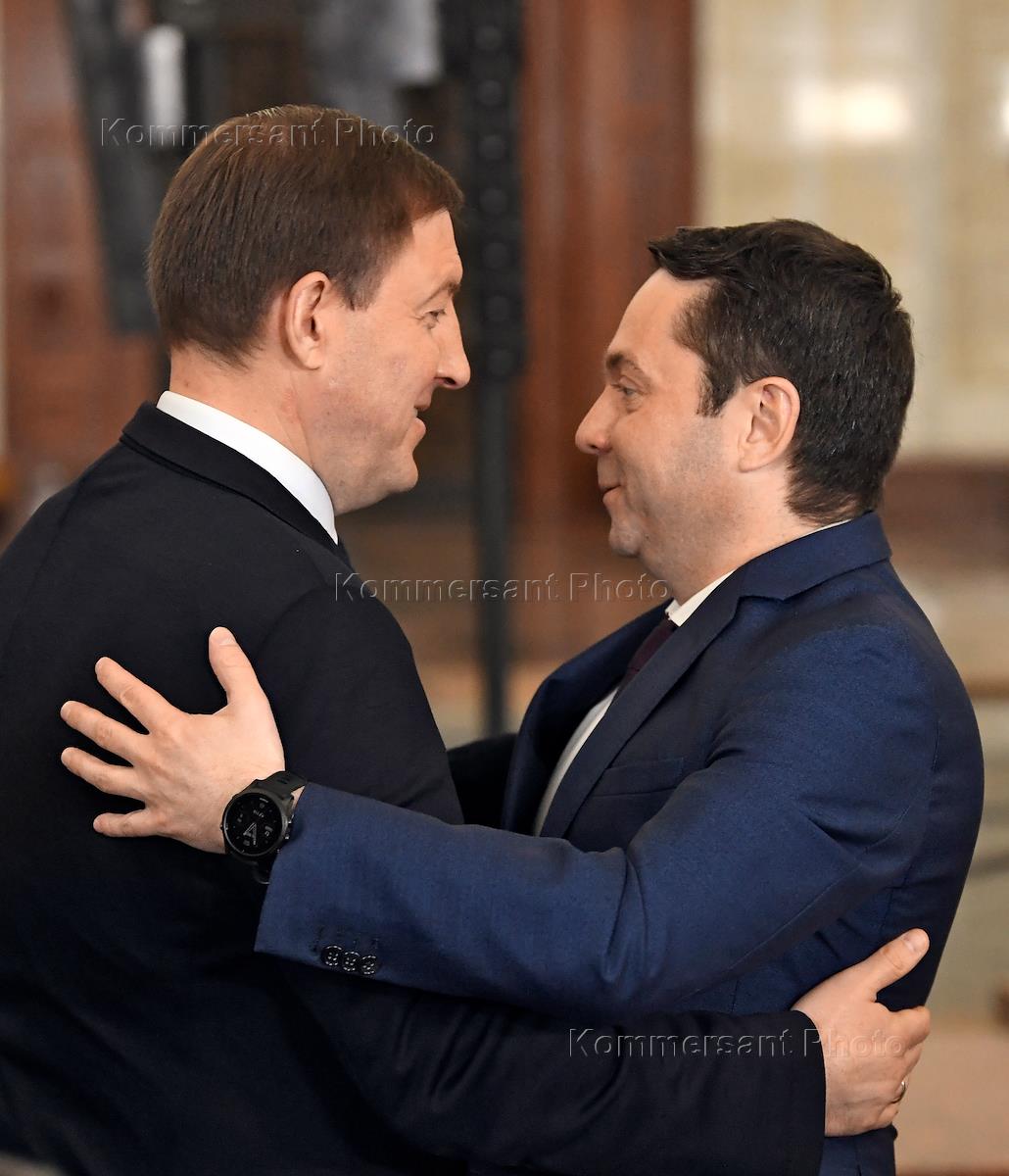 Торжественная церемония вручения "Мечей Победы" Городам воинской славы в преддверии Дня России председателем Совета Федерации России Валентиной Матвиенко в зале Славы Музея Победы на Поклонной горе. Заместитель председателя Совета Федерации России, секретарь Генсовета партии "Единая Россия" Андрей Турчак (справа) и первый заместитель председателя Совета Федерации России, представитель от исполнительного органа государственной власти Ростовской области Андрей Яцкин (слева) перед началом церемонии.