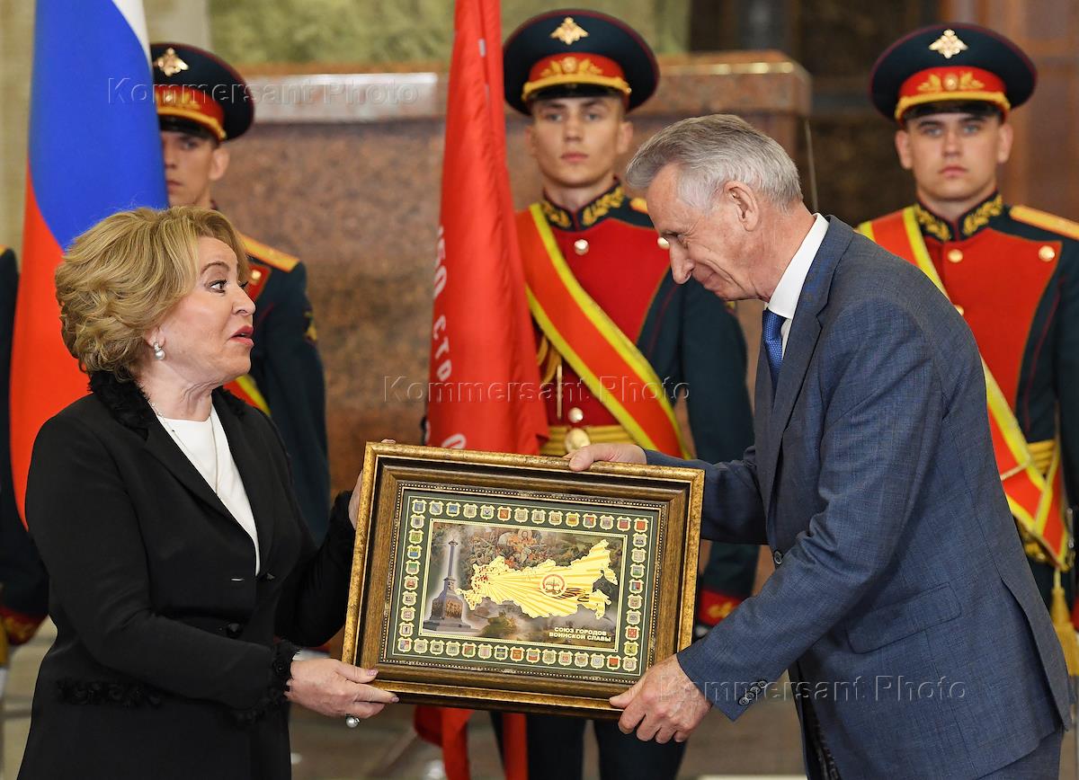 Торжественная церемония вручения "Мечей Победы" Городам воинской славы в преддверии Дня России в зале Славы Музея Победы на Поклонной горе. Председатель Совета Федерации России Валентина Матвиенко (в центре) и заместитель председателя Совета Федерации России Юрий Воробьев (справа) во время церемонии.