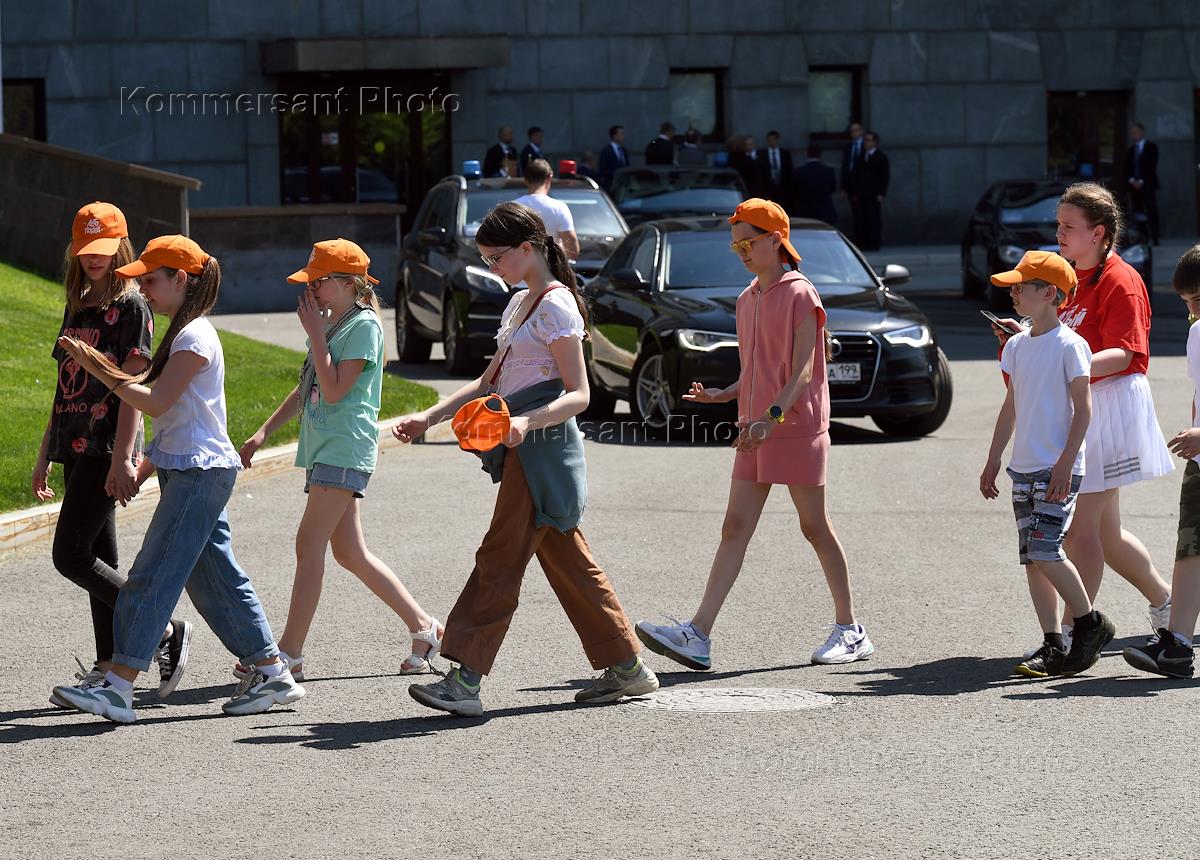Виды Москвы. Жанровая фотография. Группа детей перед началом экскурсии в Музей Победы на Поклонной горе.