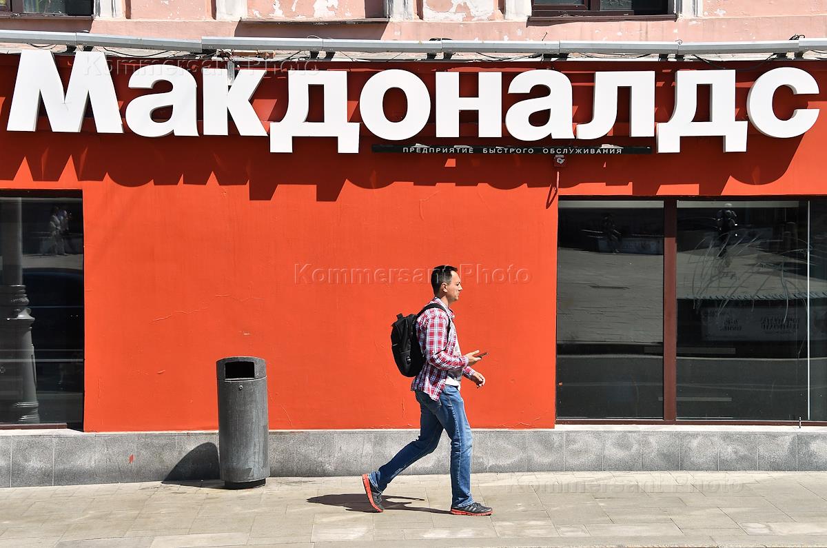 Genre photography. Announcement about the suspension of the work of fast food restaurants of the American company McDonald’s in Russia in the restaurant window.