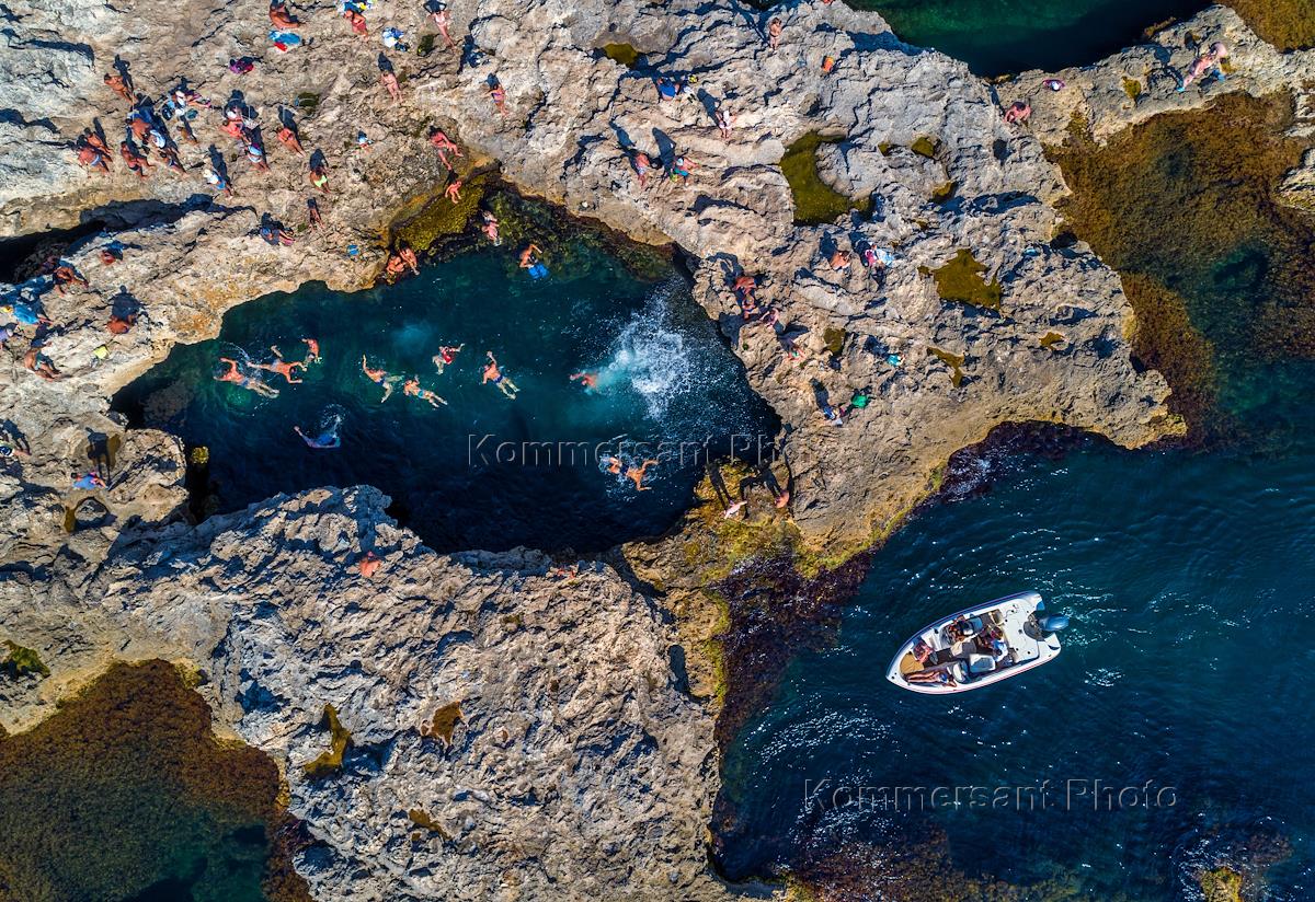 Views of Crimea. Genre photography. Vacationers swim in a small natural sea pool.