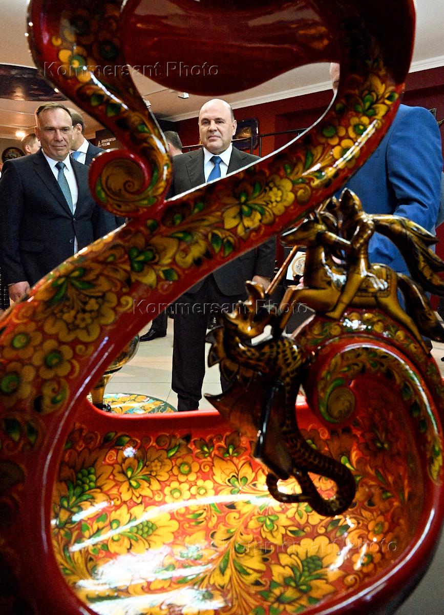 Working trip of Russian Prime Minister Mikhail Mishustin to the village of Zhostovo. Russian Prime Minister Mikhail Mishustin inspecting an exhibition of finished products at the Zhostovo decorative painting factory.