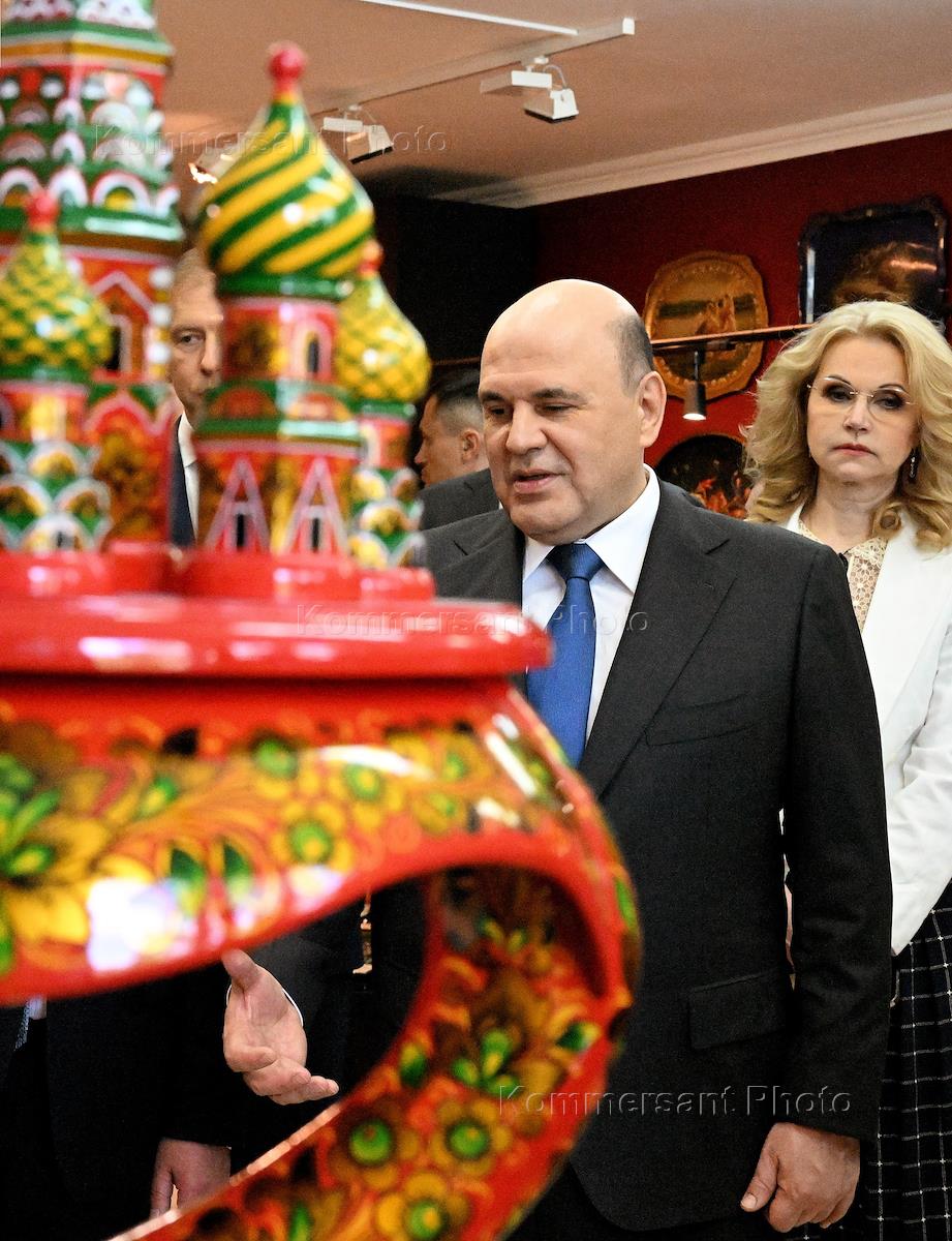 Working trip of Russian Prime Minister Mikhail Mishustin to the village of Zhostovo. Russian Prime Minister Mikhail Mishustin (center) inspecting an exhibition of finished products at the Zhostovo decorative painting factory.