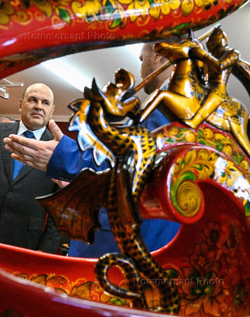 Working trip of Russian Prime Minister Mikhail Mishustin to the village of Zhostovo. Russian Prime Minister Mikhail Mishustin inspecting an exhibition of finished products at the Zhostovo decorative painting factory.