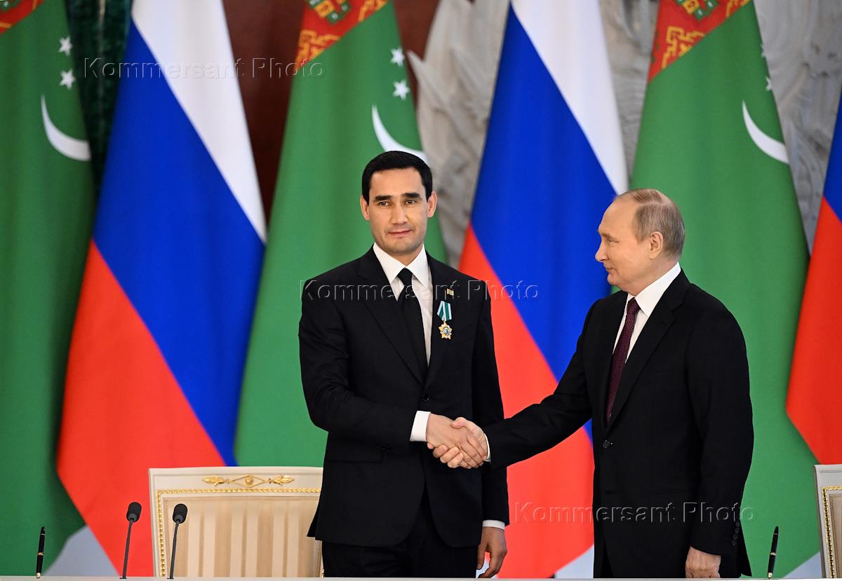 Встреча президента России Владимира Путина и президента Туркменистана Сердара Бердымухамедова (слева) в Кремле. Президент России Владимир Путин (справа) и президент Туркмении Сердар Бердымухамедов (слева) во время церемонии подписания декларации об углублении стратегического партнерства между Россией и Туркменией.