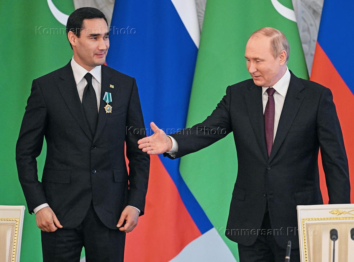 Встреча президента России Владимира Путина и президента Туркменистана Сердара Бердымухамедова (слева) в Кремле. Президент России Владимир Путин (справа) и президент Туркмении Сердар Бердымухамедов (слева) во время церемонии подписания декларации об углублении стратегического партнерства между Россией и Туркменией.