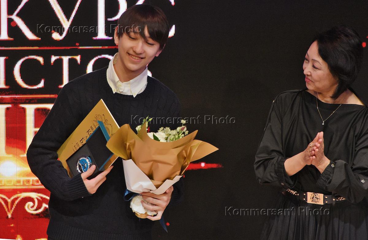 XIV International competition of ballet dancers and choreographers on the historical stage of the State Academic Bolshoi Theater (SABT). Award ceremony. Ballet dancer from Belarus Roma Gudelev (left) during the ceremony.