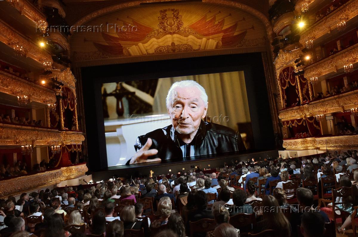 XIV International competition of ballet dancers and choreographers on the historical stage of the State Academic Bolshoi Theater (SABT). Award ceremony. Choreographer Yuri Grigorovich (on screen) during the ceremony.
