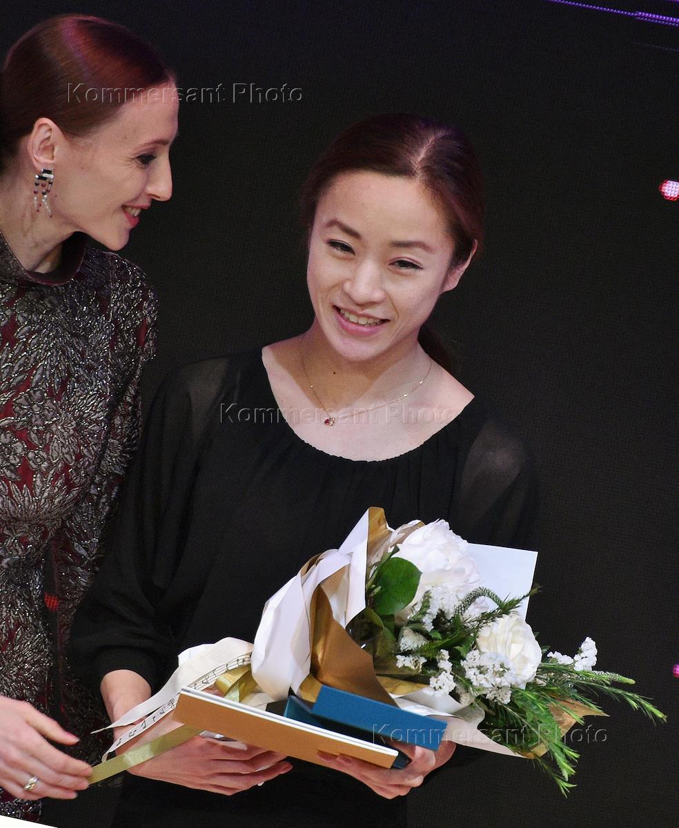 XIV Международный конкурс артистов балета и хореографов на исторической сцене Государственного академического Большого театра (ГАБТ). Церемония награждения. Солистка балета Челябинского государственного академического театра оперы и балета имени М.И. Глинки Лири Вакабаяси (справа) и прима-балерина Государственного академического Большого театра (ГАБТ) и миланского театра "Ла Скала" Светлана Захарова (слева) во время церемонии.