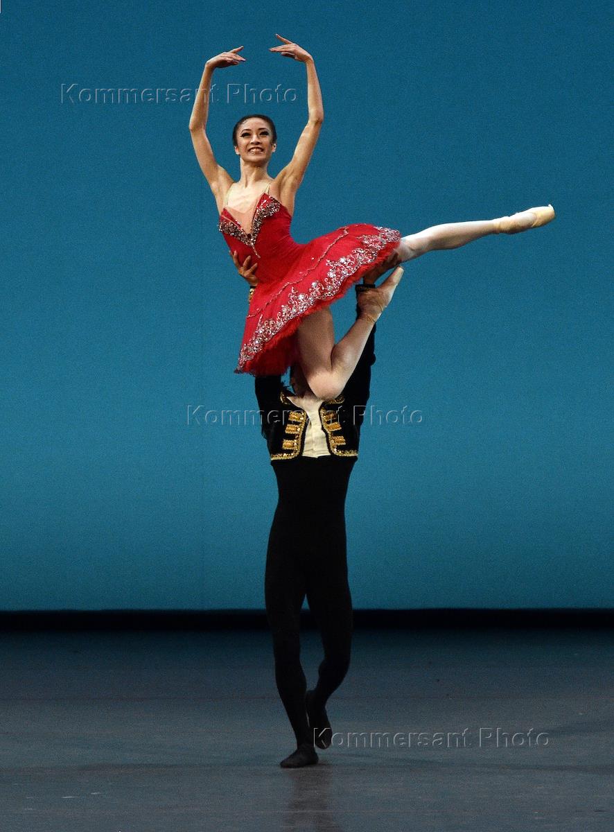 XIV International competition of ballet dancers and choreographers on the historical stage of the State Academic Bolshoi Theater (SABT). Ballet dancers Liri Wakabayashi (left) and Kubanych Shamakeev (right) during the laureates' gala concert.