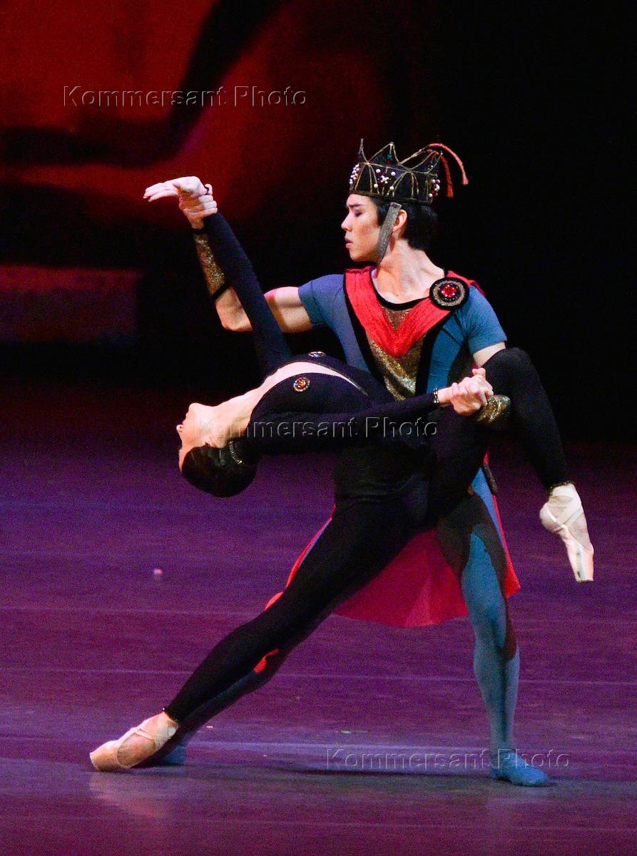 XIV International competition of ballet dancers and choreographers on the historical stage of the State Academic Bolshoi Theater (SABT). Ballet dancers Liri Wakabayashi (left) and Kubanych Shamakeev (right) during the laureates' gala concert.