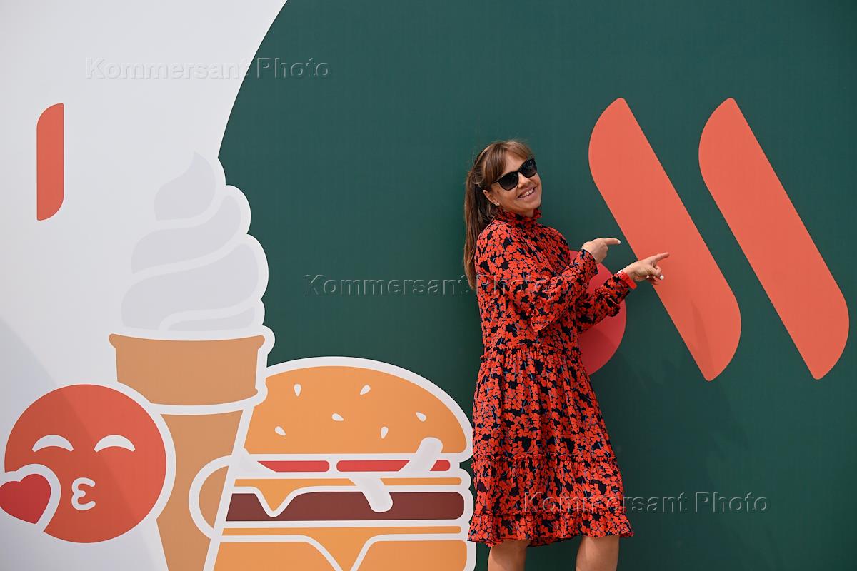 Церемония открытия обновленного ресторана McDonald's под новым брендом "Вкусно и точка" на улице Большая Бронная. С 14 марта McDonald's закрыл свои рестораны в РФ, а 16 мая компания объявила об уходе с российского рынка. Жанровая фотография. Посетительница перед новым логотипом ресторана.