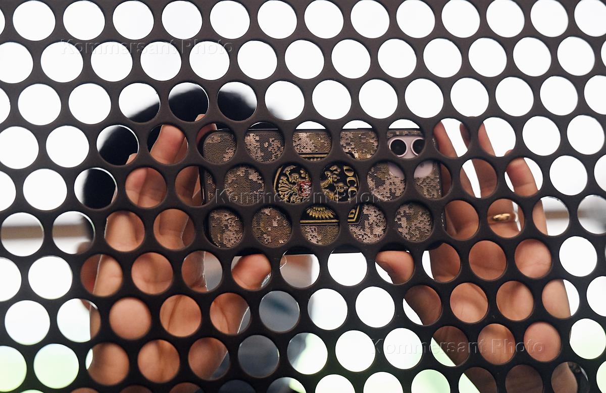 Genre photography. A man shoots on a cell phone through a grid-lattice.