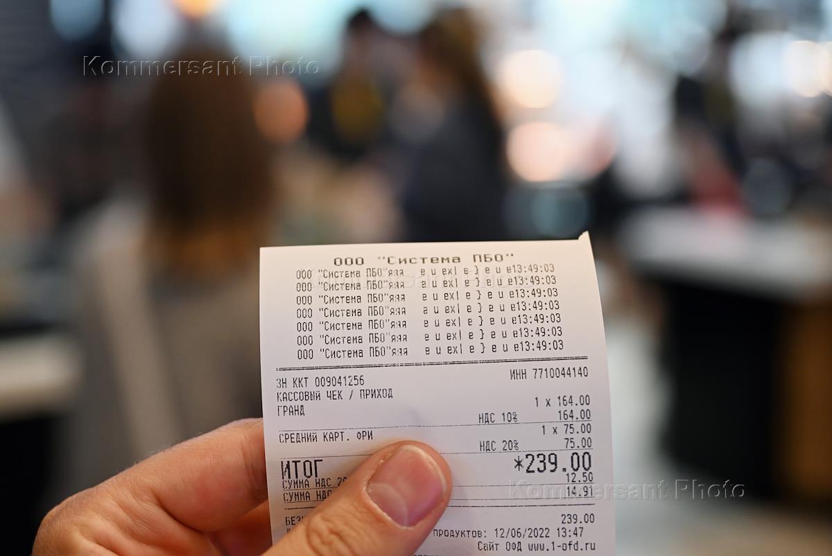The work of the renovated restaurant of the McDonald's restaurant chain under the new brand "Vkusno i Tochka" of the PBO System company on Bolshaya Bronnaya Street. The check is in the visitor's hand.