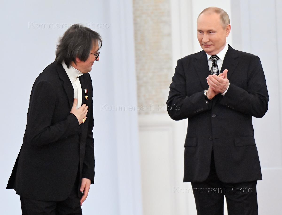The ceremony of presenting the medals of the Hero of Labor and the badges of the laureates of the State Prizes for 2021 in the St. George Hall of the Grand Kremlin Palace. Russian President Vladimir Putin (left) and chairman of the Union of Russian Cinematographers, film director Nikita Mikhalkov (center) during the ceremony.