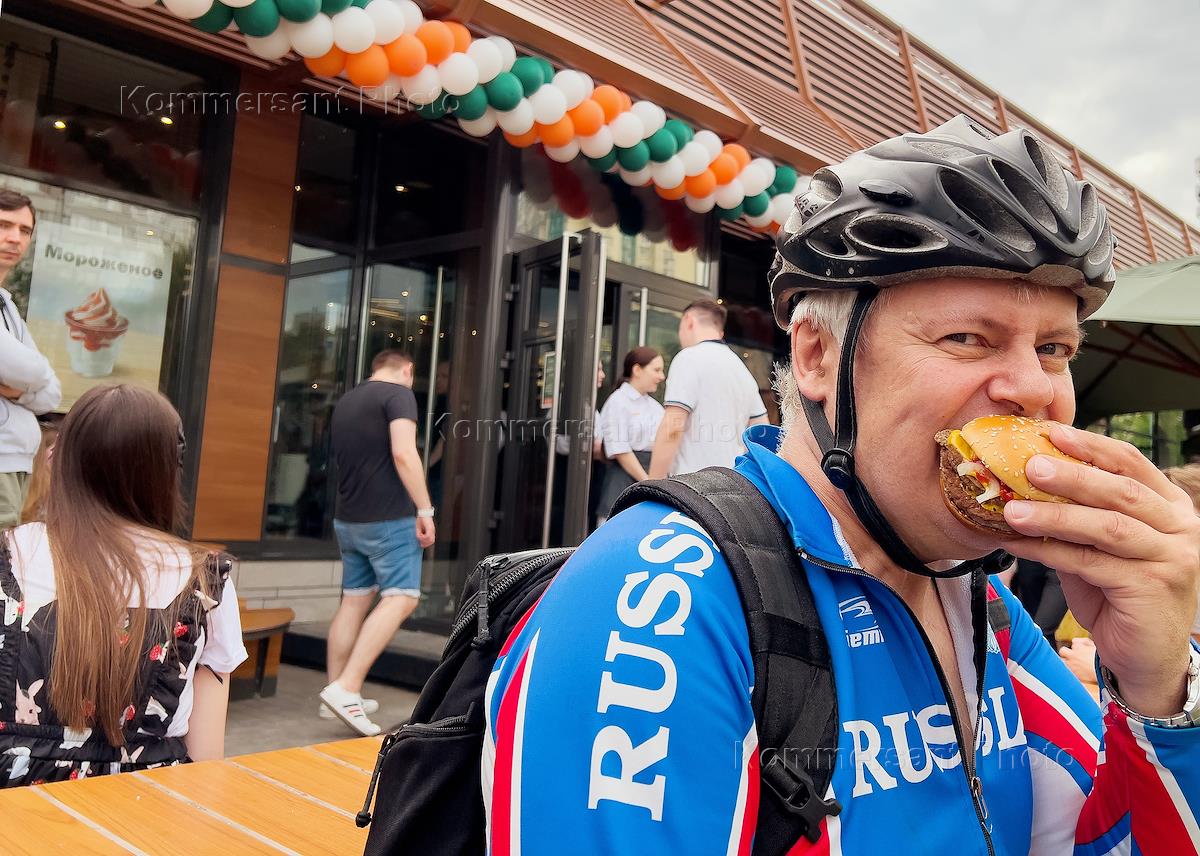 The updated restaurant of the successor to McDonald's in Russia - the Vkusno i Tochka chain on Leningradskoye Highway. Genre photography. Young people on bicycles eat burgers.