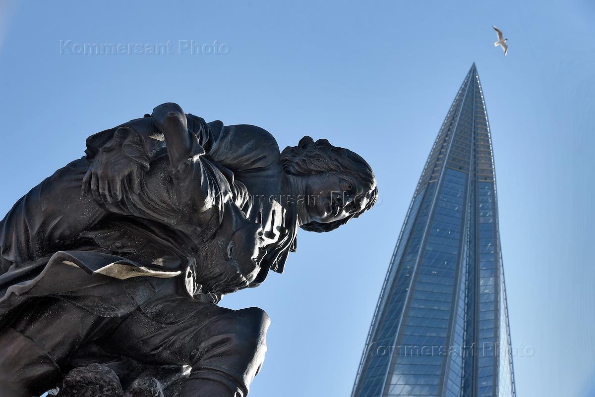 Views of St. Petersburg. Monument "Peter I Rescuing the Drowners near Lakhta", near the public and business complex "Lakhta Center". Sculptor Stepan Mokrousov-Guglielmi, architect Mikhail Mamoshin.