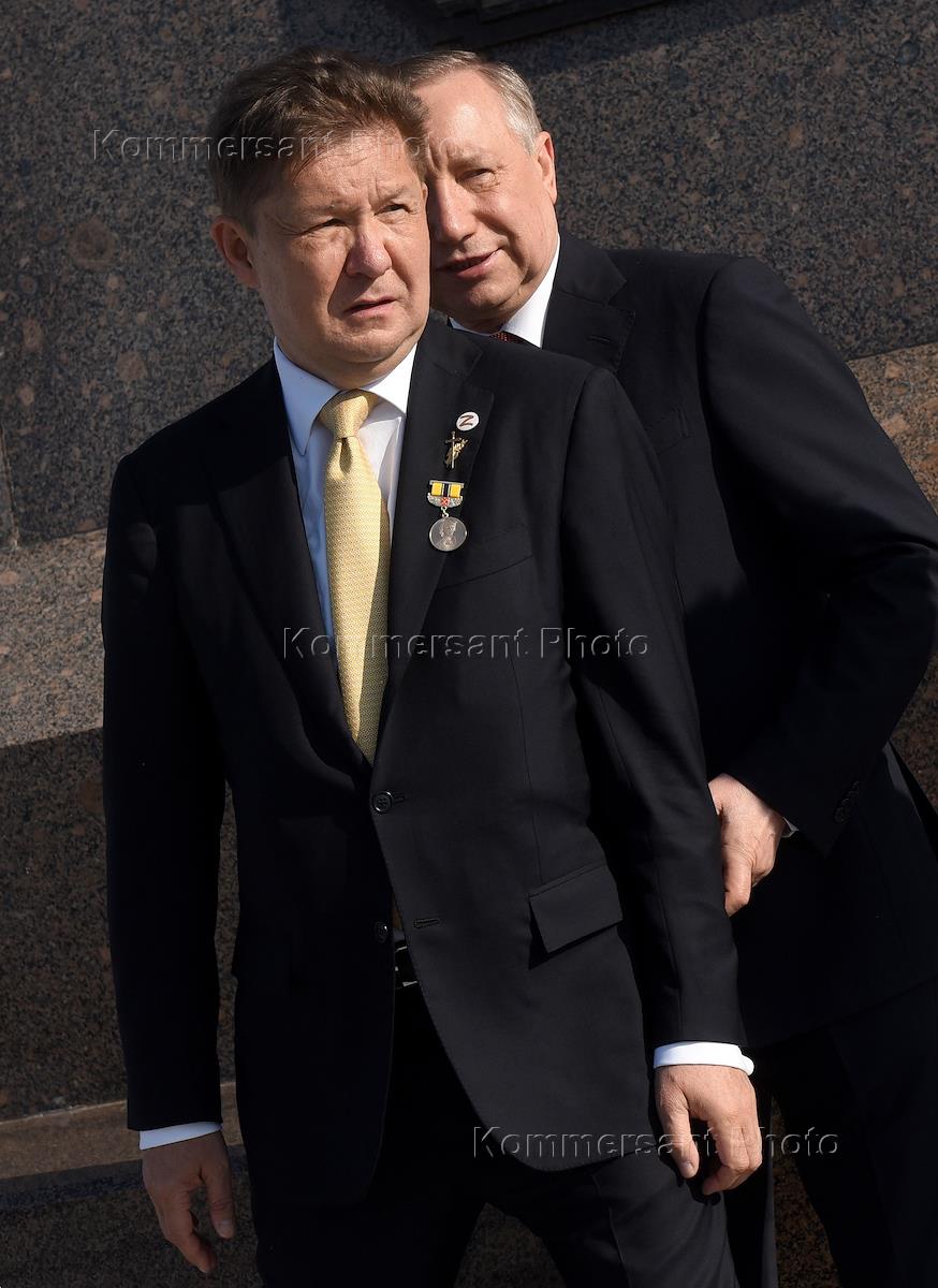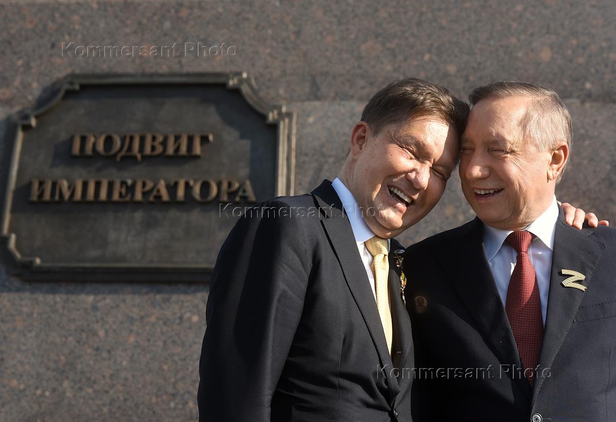 Губернатор Санкт-Петербурга Александр Беглов (справа) и председатель правления компании "Газпром" (Россия) Алексей Миллер (слева) во время церемонии открытия памятника "Петр I, спасающий утопающих близ Лахты" возле общественно-делового комплекса "Лахта Центр" .