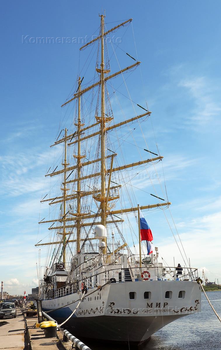 Sailing training ship frigate "Mir" at the berth of the Big Port of St. Petersburg.