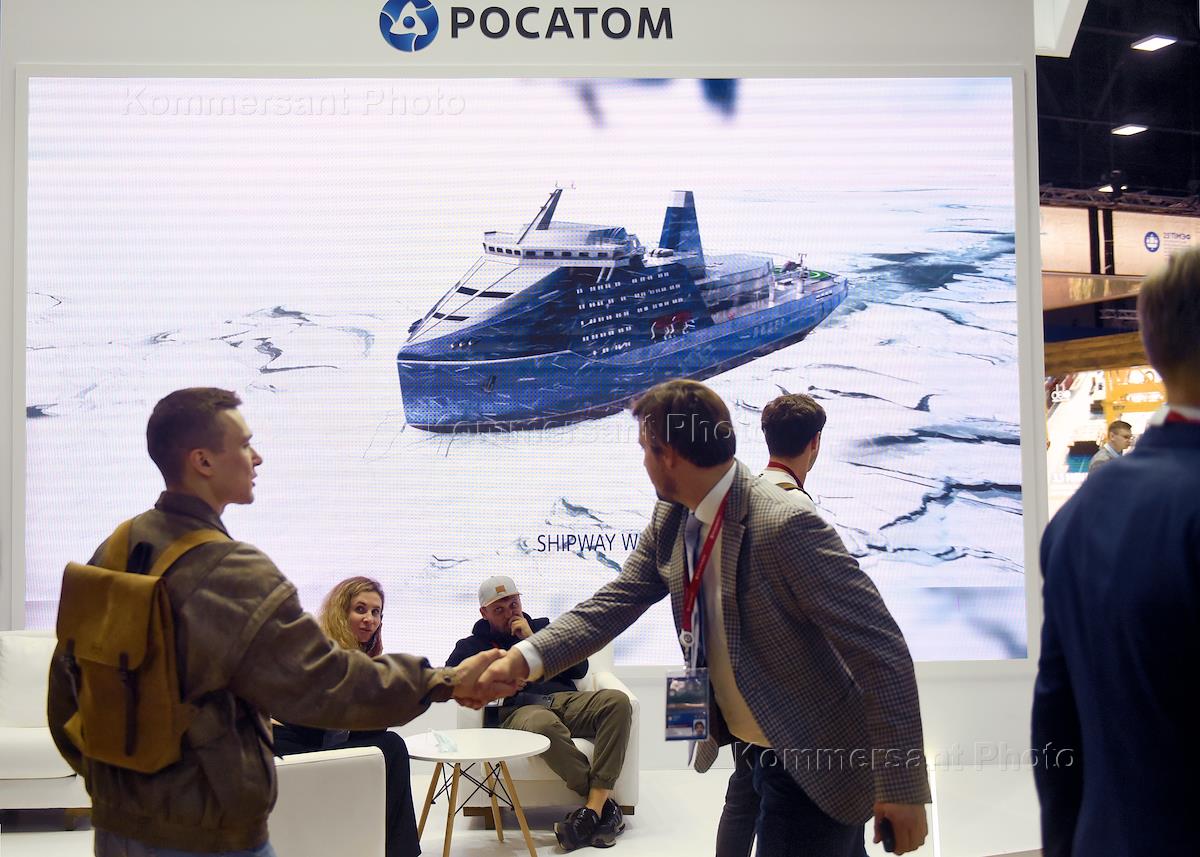 XXV St. Petersburg International Economic Forum (SPIEF) 2022 at the Expoforum Convention and Exhibition Center (CEC). Genre photography. The stand of the Rosatom company in the lobby of the center.