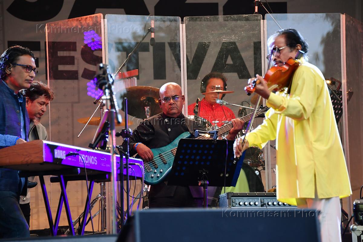 Moscow Jazz Festival. The first day. Musician Dr. Lakshminarayana Subramaniam (right) during a performance in the Hermitage Garden.