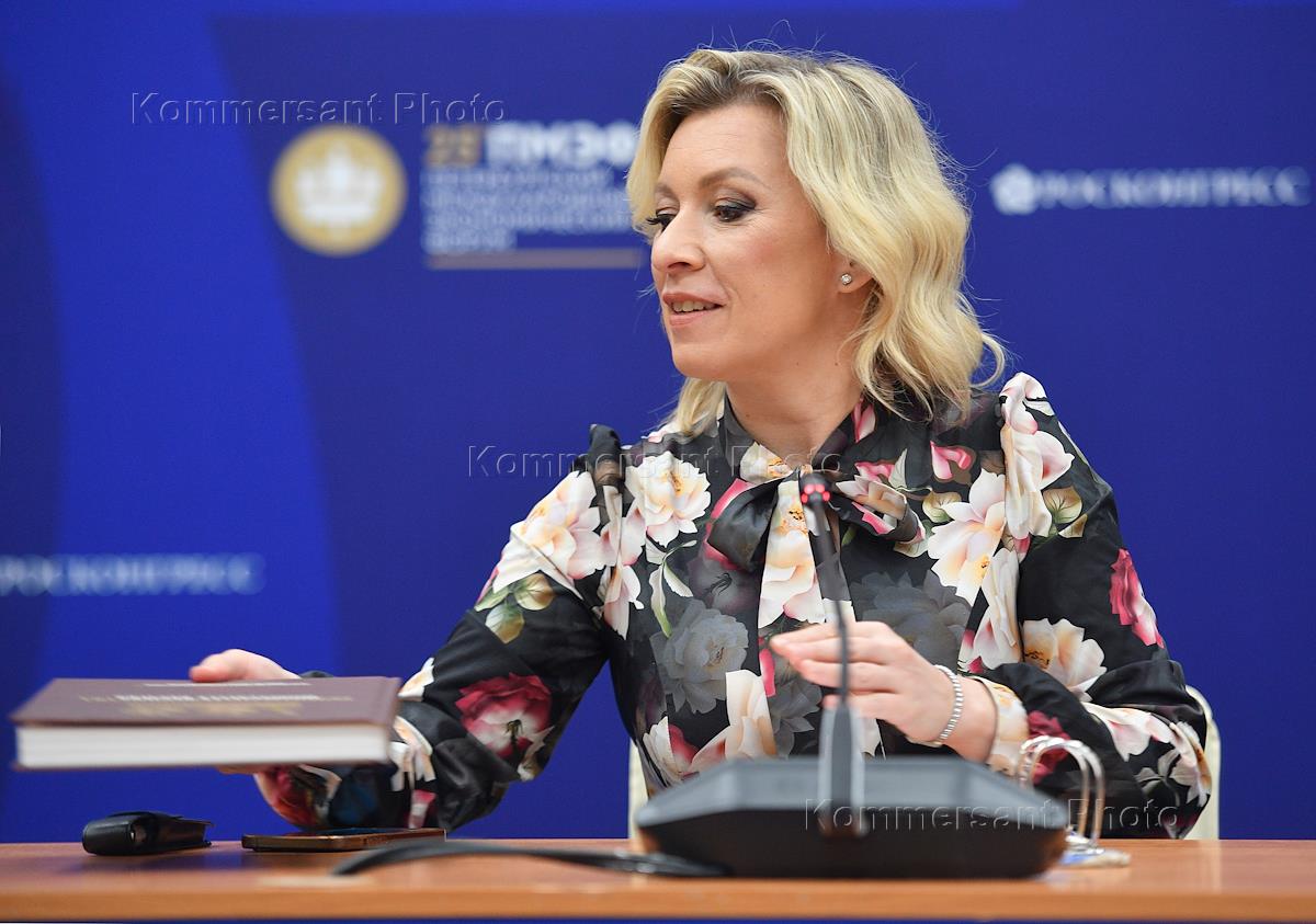 XXV St. Petersburg International Economic Forum (SPIEF) 2022 at the Expoforum Convention and Exhibition Center (CEC). Manager of the Information and Press Department of the Russian Foreign Ministry Maria Zakharova during a briefing on current foreign policy issues.