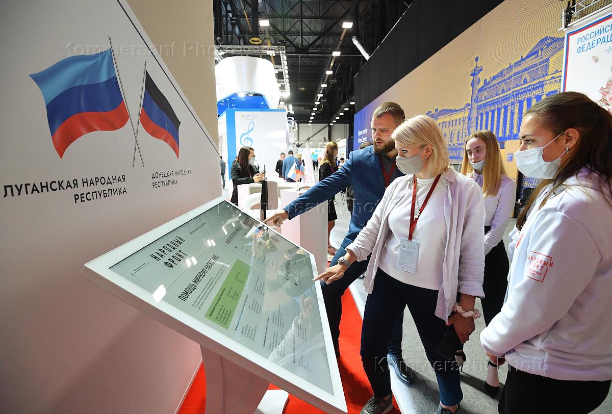 XXV Петербургский международный экономический форум (ПМЭФ) 2022 в конгрессно-выставочном центре (КВЦ) "Экспофорум". Жанровая фотография. Участники форума у стенда Луганской и Донецкой Народных Республик (ЛДНР).
