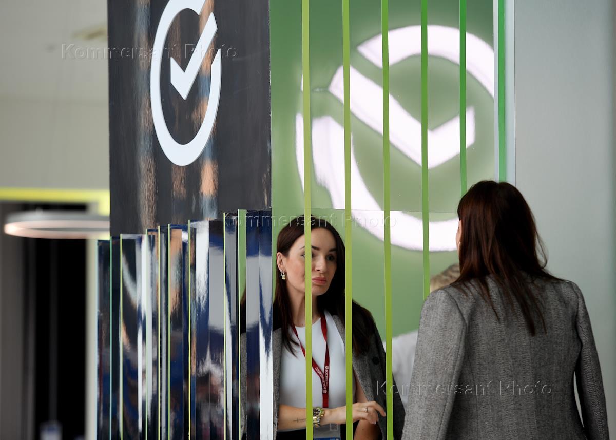 XXV Петербургский международный экономический форум (ПМЭФ) 2022 в конгрессно-выставочном центре (КВЦ) "Экспофорум". Жанровая фотография. Логотип Сбербанка на стенде компании.
