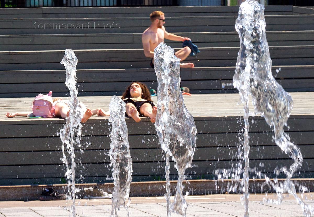 Виды летней Москвы. Жанровая фотография. Отдыхающие загорают у фонтана в парке "Музеон".