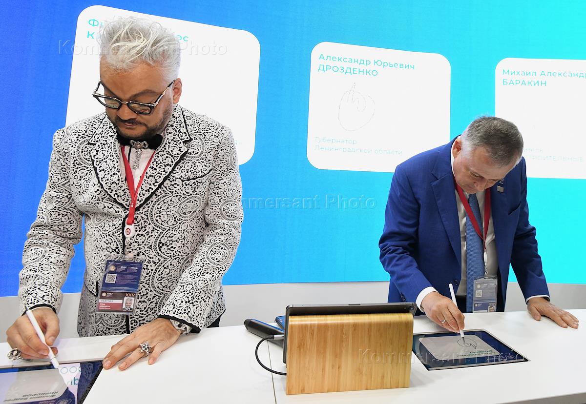 XXV St. Petersburg International Economic Forum (SPIEF) 2022 at the Expoforum Convention and Exhibition Center (CEC). Governor of the Leningrad Region Alexander Drozdenko at the signing ceremony with singer Filipp Kirkorov of an agreement on the construction of a large shopping and entertainment complex in the village of Novosaratovka.