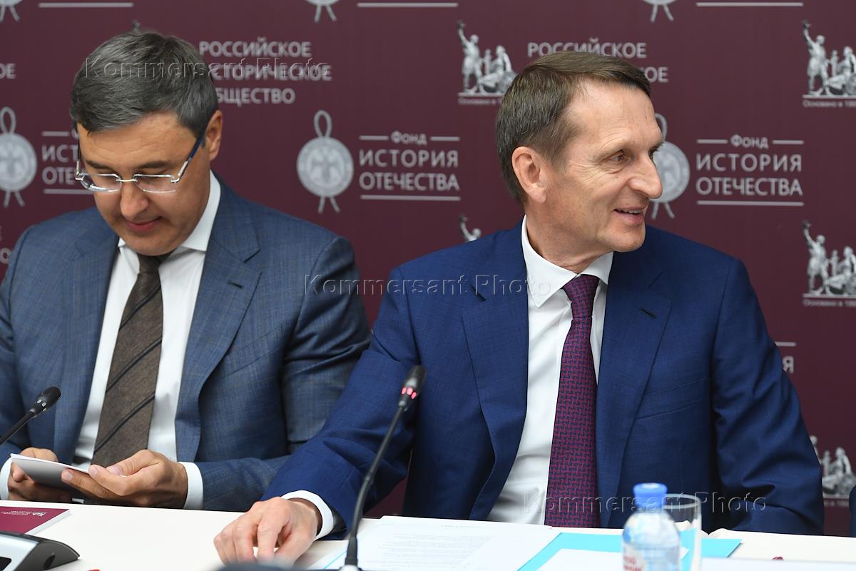 Встреча министра науки и высшего образования Валерия Фалькова и председателя Российского исторического общества Сергея Нарышкина с молодыми учеными-историками в Доме Российского исторического общества. Директор Института археологии РАН Николай Макаров (справа) и председатель Российского исторического общества Сергей Нарышкин (слева) во время встречи.