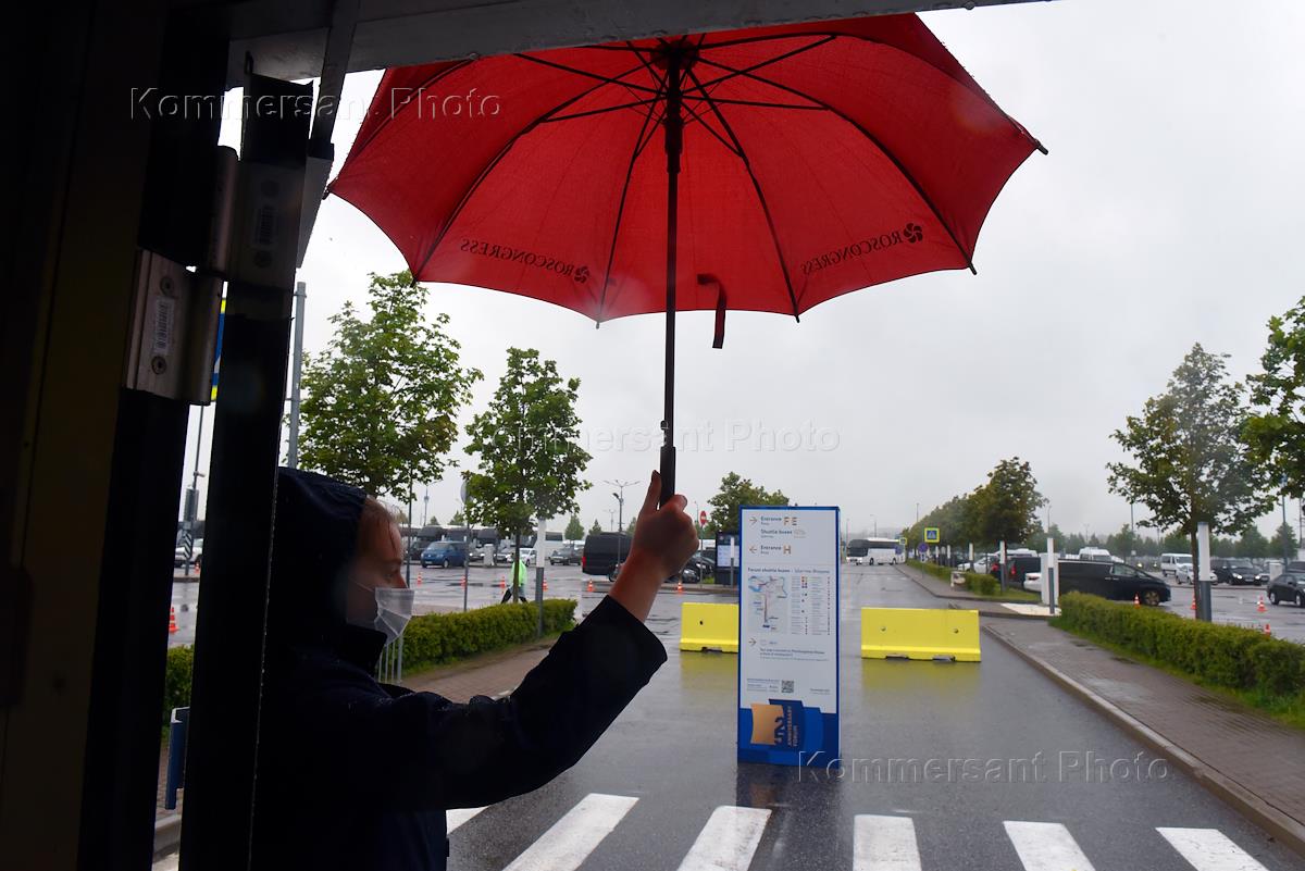 XXV Петербургский международный экономический форум (ПМЭФ) 2022 в конгрессно-выставочном центре (КВЦ) "Экспофорум". Жанровая фотография. Девушка с зонтом возле здания "Экспофорум".