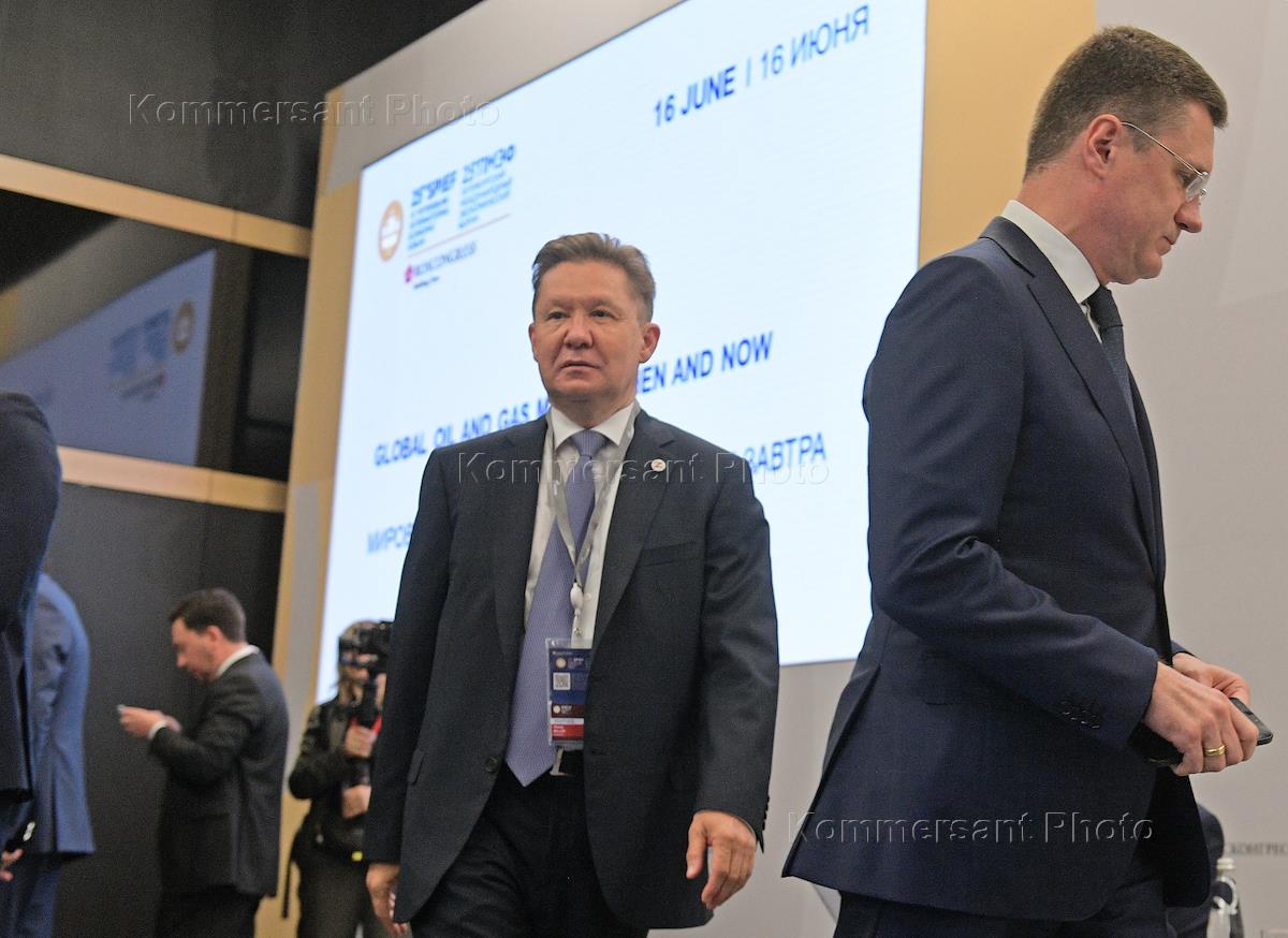XXV Петербургский международный экономический форум (ПМЭФ) 2022 в конгрессно-выставочном центре (КВЦ) "Экспофорум". Сессия "Мировой рынок нефти и газа сегодня и завтра". Председатель правления, заместитель председателя совета директоров ПАО "Газпром" Алексей Миллер (слева) и заместитель председателя правительства России Александр Новак (справа) во время сессии.