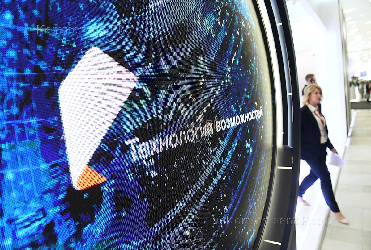XXV St. Petersburg International Economic Forum (SPIEF) 2022 at the Expoforum Convention and Exhibition Center (CEC). Genre photography. Stand of the company "Rostec". The inscription on the screen "Technologies of Opportunities".