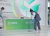 XXV St. Petersburg International Economic Forum (SPIEF) 2022 at the Expoforum Convention and Exhibition Center (CEC). Genre photography. SBER stand at the forum. An employee of a cleaning company during cleaning at the stand.