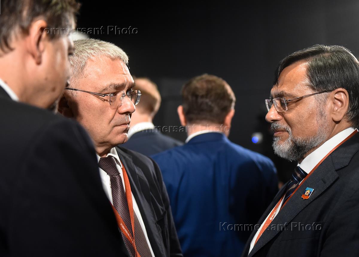XXV Петербургский международный экономический форум (ПМЭФ) 2022 в конгрессно-выставочном центре (КВЦ) "Экспофорум". День второй. Сессия "Соединяя пространство и технологии: новые решения для комплексного развития территорий". Руководитель Федеральной службы государственной регистрации, кадастра и картографии (Росреестр) Олег Скуфинский (слева) и губернатор Пермского края Дмитрий Махонин (в центре) перед началом сессии.