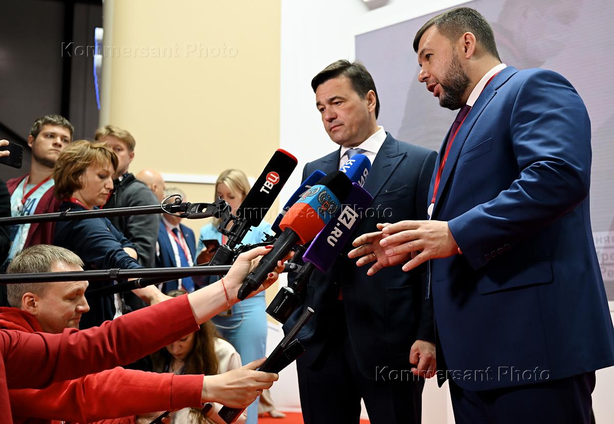 XXV St. Petersburg International Economic Forum (SPIEF) 2022 at the Expoforum Convention and Exhibition Center (CEC). Governor of the Moscow Region Andrei Vorobyov (center) and head of the DPR Denis Pushilin (right) after signing a cooperation agreement.