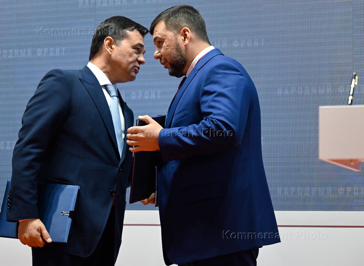 XXV St. Petersburg International Economic Forum (SPIEF) 2022 at the Expoforum Convention and Exhibition Center (CEC). Governor of the Moscow Region Andrei Vorobyov (center) and head of the DPR Denis Pushilin (right) after signing a cooperation agreement.