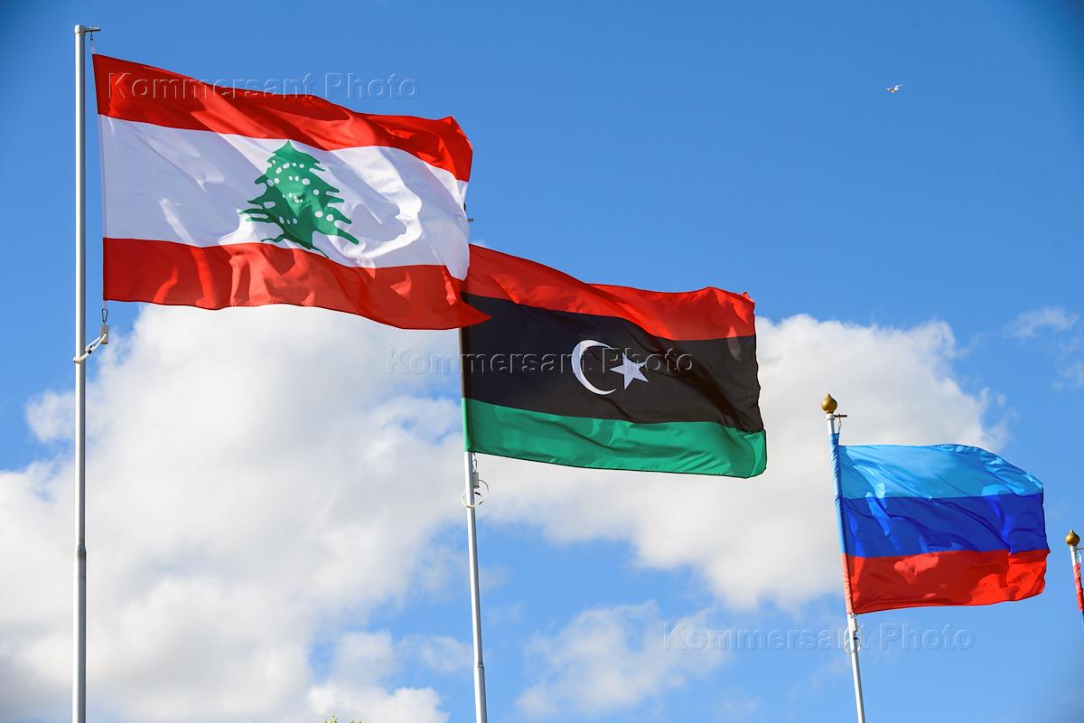 XXV Петербургский международный экономический форум (ПМЭФ) 2022 в конгрессно-выставочном центре (КВЦ) "Экспофорум". Жанровая фотография. Государственные флаги Ливана, Ливии и ЛНР.
