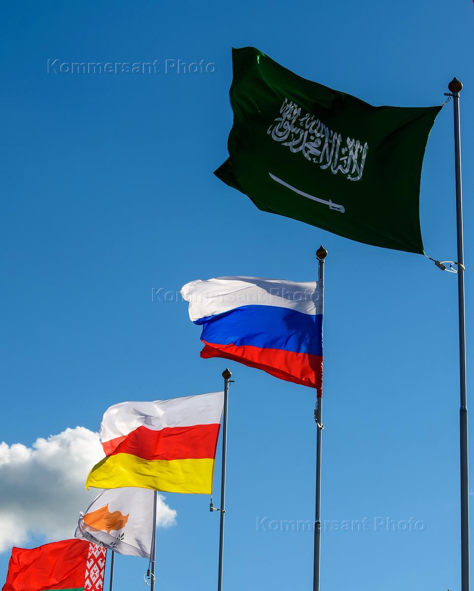XXV St. Petersburg International Economic Forum (SPIEF) 2022 at the Expoforum Convention and Exhibition Center (CEC). Genre photography. State flags of Belarus, Cyprus, South Ossetia, Russia and Saudi Arabia.