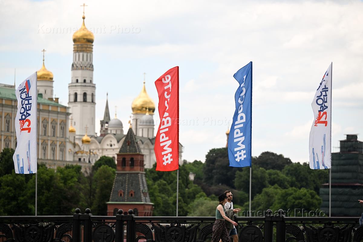 Празднование Дня России. Жанровая фотографии. Флаги в честь Дня России на балюстраде Большого Каменного моста.