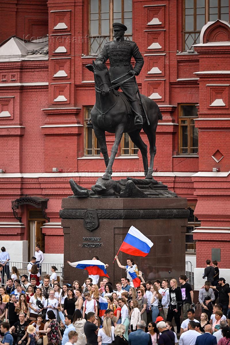 Праздничный концерт, посвященный Дню России на Красной площади. Жанровая фотография. Люди, гуляющие на Манежной площади, перед началом концерта.