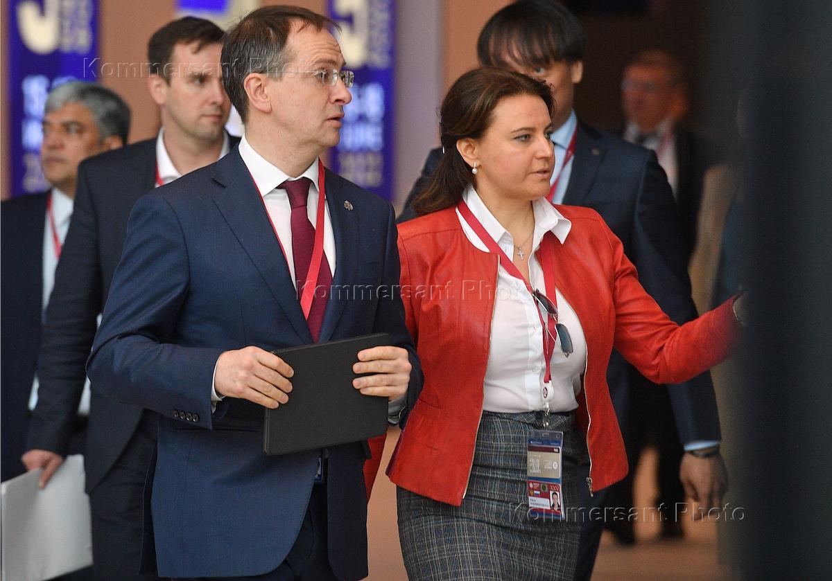 XXV Петербургский международный экономический форум (ПМЭФ) 2022 в конгрессно-выставочном центре (КВЦ) "Экспофорум". Помощник президента России Владимир Мединский (слева) и руководитель аппарата помощника президента России Владимира Мединского Елена Подобреевская (справа) во время форума.