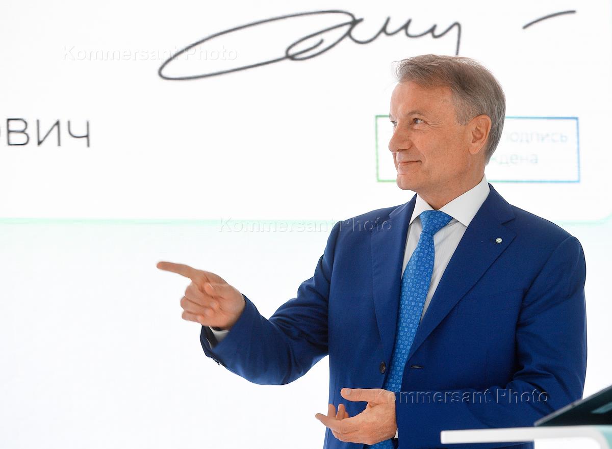 XXV St. Petersburg International Economic Forum (SPIEF) 2022 at the Expoforum Convention and Exhibition Center (CEC). President, Chairman of the Board of the Savings Bank of Russia German Gref at the signing of a cooperation agreement with Russian Railways.